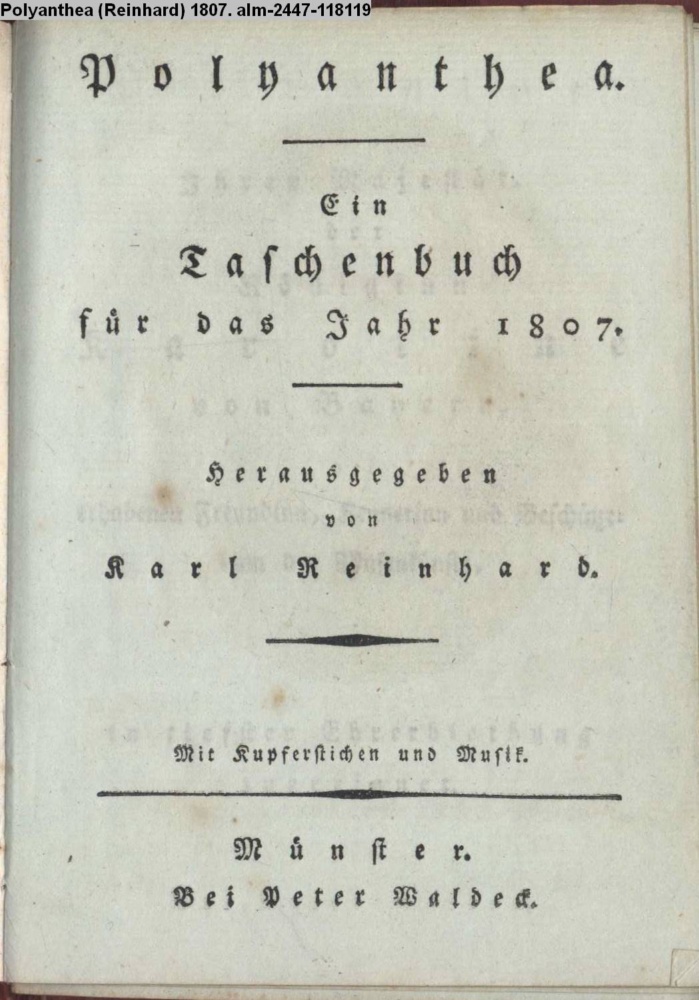 Polyanthea / Ein / Taschenbuch / für das Jahr 1807. / Herausgegeben / von / Karl Reinhard. / Mit Kupferstichen und Musik. / Münster / Bei Peter Waldeck
