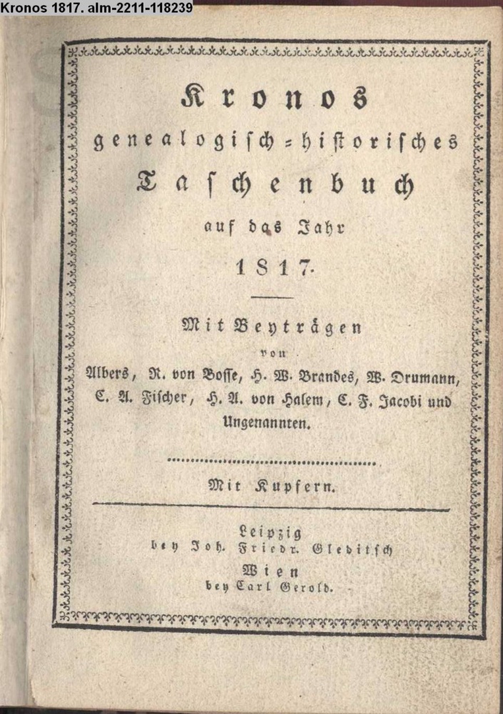 Kronos / genealogisch-historisches / Taschenbuch / auf das Jahr / 1817. / Mit Beyträgen / von / Albers, R. von Bosse, H. W. Brandes, W. Drumann, / C. A. Fischer, H. A. von Halem, C. F. Jacobi und / Ungenannten. / Mit Kupfern. / Leipzig / bey Joh. Friedr. Gleditsch / Wien / bey Carl Gerold