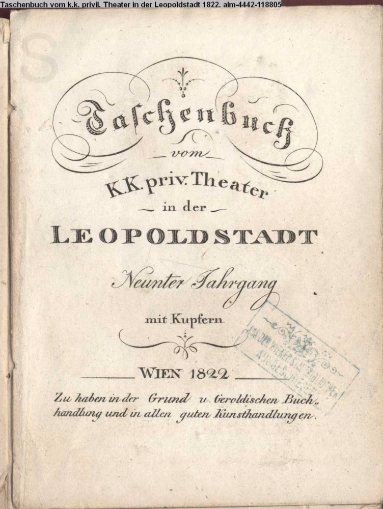 Taschenbuch / des / kaiserl. königl. privil. / Leopoldstädter Theaters / für das Jahr / 1822. / Herausgegeben / zum Besten der hinterlassenenen Familie des Schauspielers / Ziegelhauser / von / Carl Meisl. / Neunter Jahrgang / Wien, 1822. / Gedruckt, mit Math. Andreas Schmid'schen Schriften
