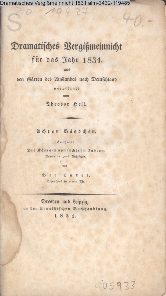 Dramatisches / Vergißmeinnicht / für das Jahr 1831 / aus / den Gärten des Auslandes nach Deutschland / verpflanzt / von / Theodor Hell. / Achtes Bändchen. / Enthält: / Die Königin von sechzehn Jahren. / Drama in zwei Aufzügen. / und / Der Enkel. / Schauspiel in einem Akt. / Dresden und Leipzig, / in der Arnoldischen Buchhandlung. / 1831
