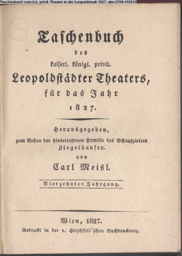 Taschenbuch / des / kaiserl. königl. privil. / Leopoldstädter Theaters, / für das Jahr / 1827. / Herausgegeben / zum Besten der hinterlassenen Familie des Schauspielers / Ziegelhauser, / von / Carl Meisl. / Vierzehnter Jahrgang. / Wien, 1827. / Gedruckt in der v. Hirschfeld'schen Buchdruckerey