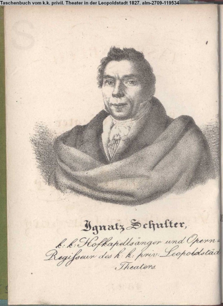 Taschenbuch / des / kaiserl. königl. privil. / Leopoldstädter Theaters, / für das Jahr / 1827. / Herausgegeben / zum Besten der hinterlassenen Familie des Schauspielers / Ziegelhauser, / von / Carl Meisl. / Vierzehnter Jahrgang. / Wien, 1827. / Gedruckt in der v. Hirschfeld'schen Buchdruckerey