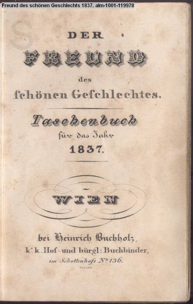 DER / FREUND / des / schönen Geschlechtes. / Taschenbuch / für das Jahr / 1837. / WIEN / bei Heinrich Buchholz. / k.k. Hof- und bürgl. Buchbinder, / im Schottenhofe No. 136