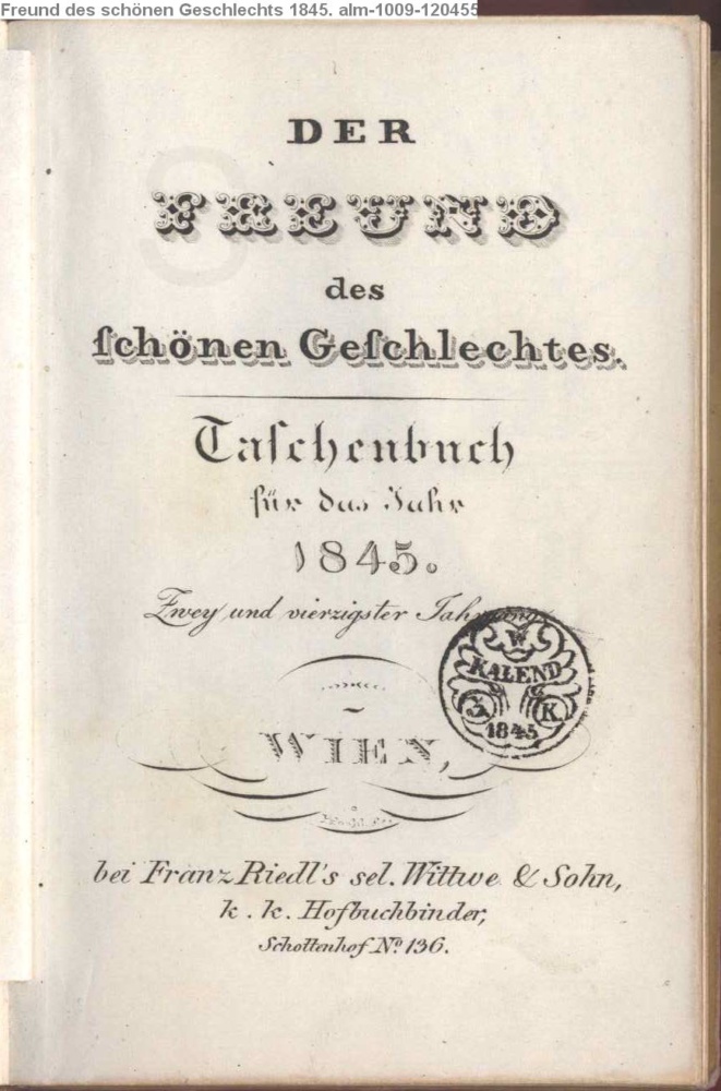 DER / FREUND / des / schönen Geschlechtes. / Taschenbuch / für das Jahr / 1845. / Zwey und vierzgster Jahrgang / WIEN, / bei Franz Riedl's sel. Wittwe & Sohn, / k.k. Hofbuchbinder; / Schottenhof No. 136
