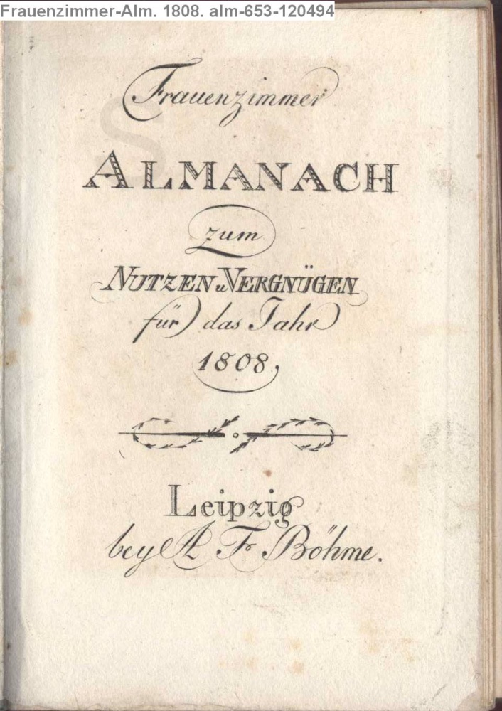 Frauenzimmer / ALMANACH / zum / NUTZEN u. VERGNÜGEN. / für das Jahr / 1808. / Leipzig / bey A. F. Böhme
