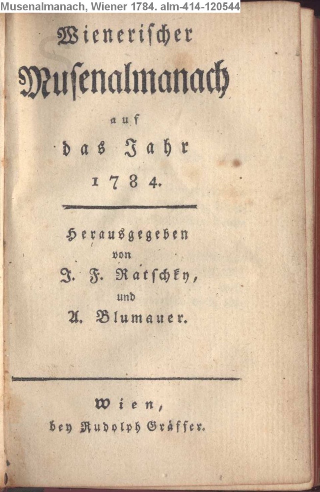 Wienerischer / Musenalmanach, / auf / das Jahr / 1784. / Herausgegeben / von / J. F. Ratschky, / und / A. Blumauer. / Wien, / bey Rudolph Gräffer