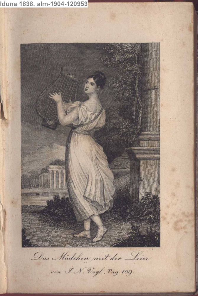 IDUNA. / TASCHENBUCH FÜR 1838. / Achtzehnter Jahrgang / Edlen Frauen und Mädchen gewidmet. / Motto: / Ehret die Frauen, sie flechten und weben / Himmlische Rosen in's irdische Leben, / Schiller / Wien und Leipzig / Verlag von Fried. Wilh. Pfautsch, / Seitzergasse No. 423