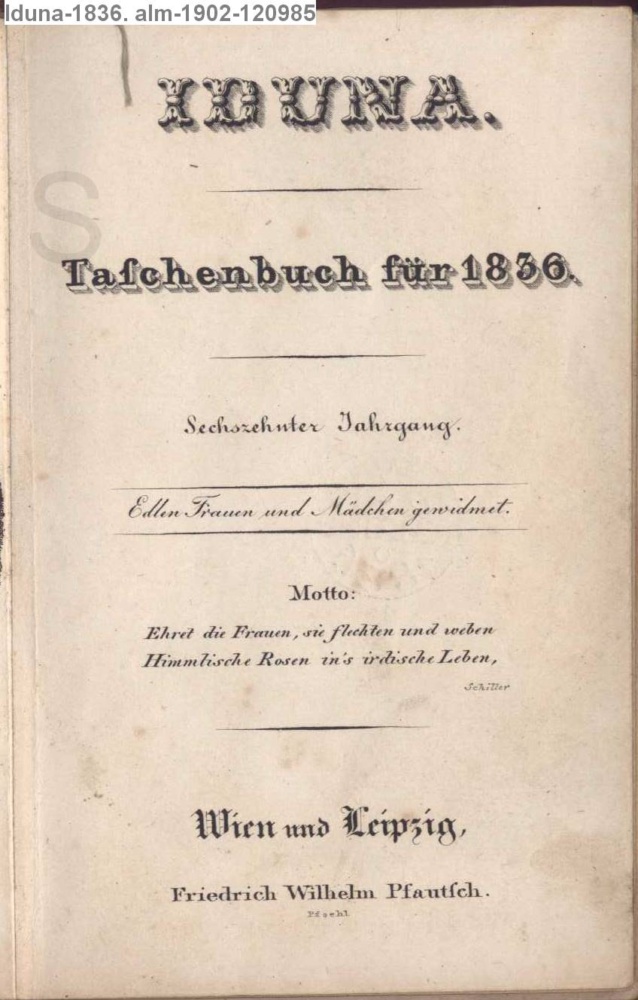 IDUNA. / Taschenbuch für 1836. / Sechszehnter Jahrgang. / Edlen Frauen und Mädchen gewidmet. / Motto: / Ehrt die Frauen, sie flechten und weben / Himmlische Rosen in's irdische Leben, / Schiller / Wien und Leipzig, / Friedrich Wilhelm Pfautsch