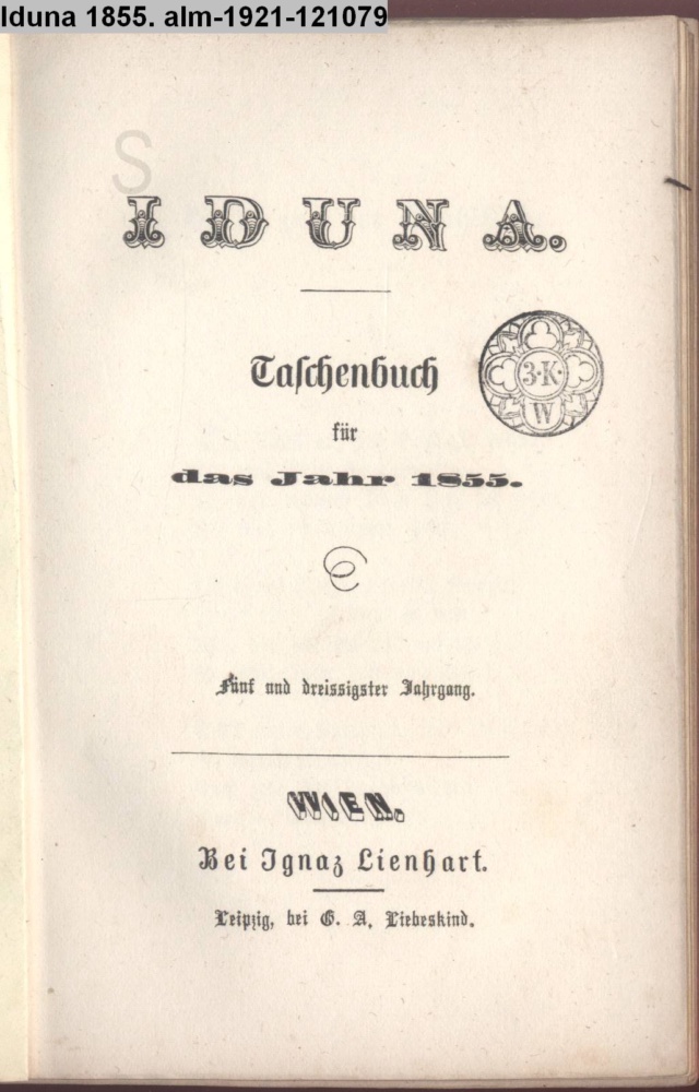 IDUNA. / Taschenbuch / für / das Jahr 1855. / Fünf und dreissigster Jahrgang. / WIEN. / Bei Ignaz Lienhart. / Leipzig, bei G. A. Liebeskind