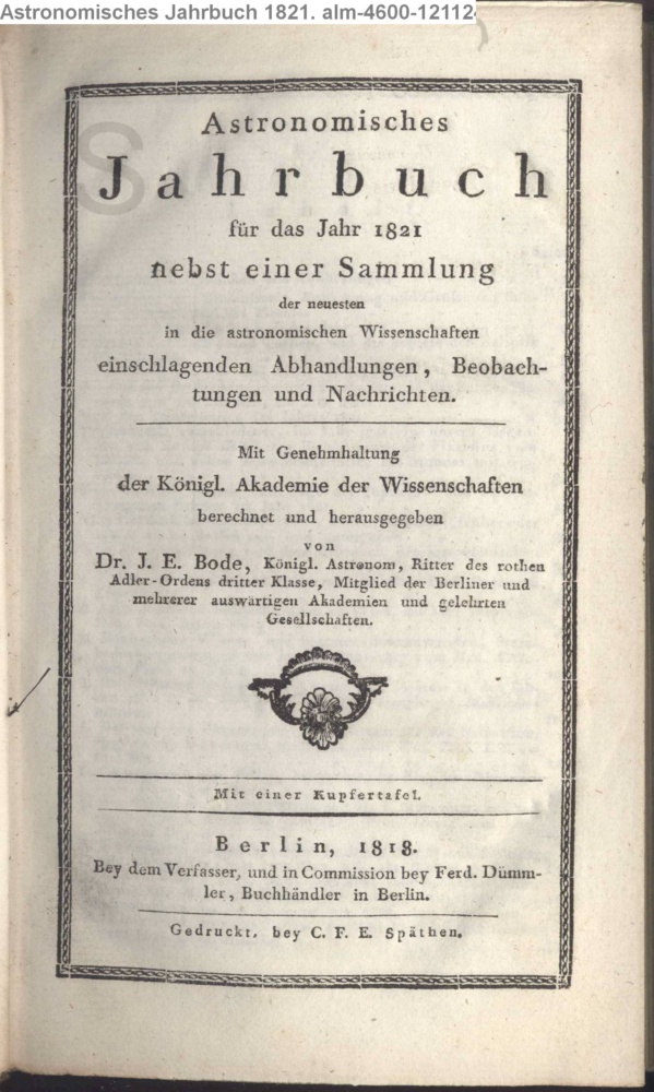 Astronomisches / Jahrbuch / für das Jahr 1821 / nebst einer Sammlung / der neuesten / in die astronomischen Wissenschaften / einschlagenden Abhandlungen, Beobach- / tungen und Nachrichten. / Mit Genehmhaltung / der Königl. Akademie der Wissenschaften / berechnet und herausgegeben / von / Dr. J. E. Bode, Königl. Astronom [...] / Mit einer Kupfertafel. / Berlin, 1818. / Bey dem Verfasser, und in Commission bey Ferd. Dümm- / ler, Buchhändler in Berlin. / Gedruckt bey C. F. E. Späthen