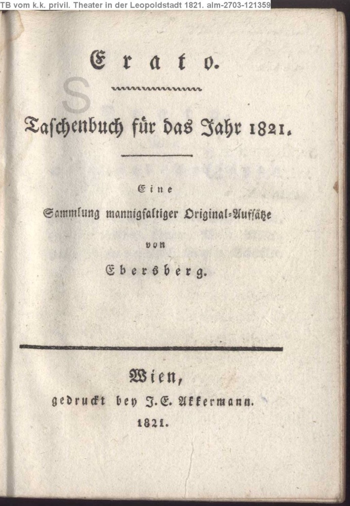 Erato. / Taschenbuch für das Jahr 1821. / Eine / Sammlung mannigfaltiger Original-Aufsätze / von / Ebersberg. / Wien, / gedruckt bey J. E. Akkermann