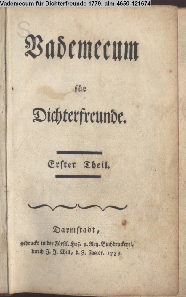 Vademecum / für / Dichterfreunde. / Erster Theil. / Darmstadt, / gedruckt in der Fürstl. Hof- und Reg. Buchdruckerei, / durch J. J. Will, d. Z. Factor. 1779
