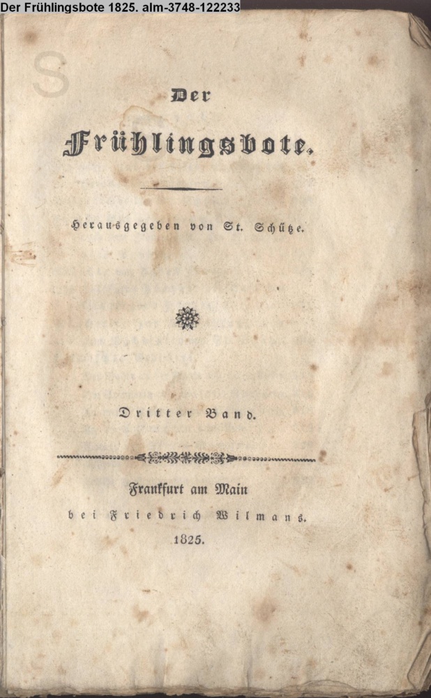 Der / Frühlingsbote. / Herausgegeben von St. Schütze. / Dritter Band. / Frankfurt am Main / bei Friedrich Wilmans. / 1825