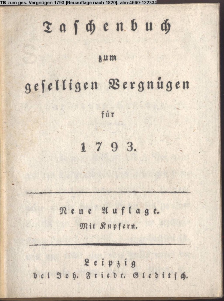 Taschenbuch / zum / geselligen Vergnügen / für 1793. / Neue Auflage. / Mit Kupfern. / Leipzig / bei Joh. Friedrich Gleditsch