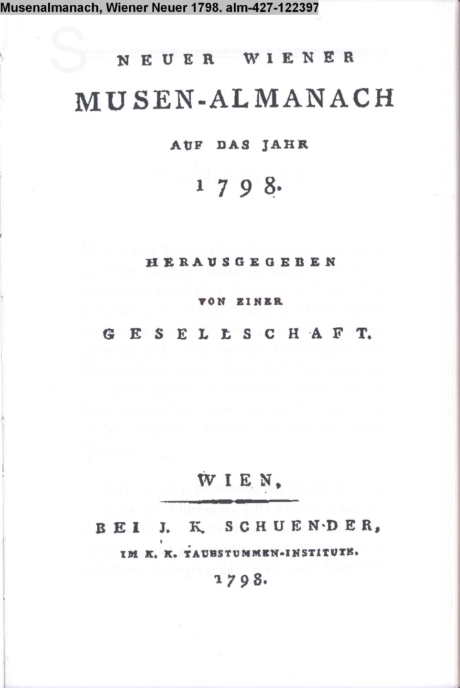 NEUER WIENER / MUSEN- / ALMANACH / AUF DAS JAHR / 1798. / HERAUSGEGEBEN / VON EINER / GESELLSCHAFT. / WIEN. / BEI J. K. SCHUENDER, / IM K.K. TAUBSTUMMEN-INSTITUTE. / 1798