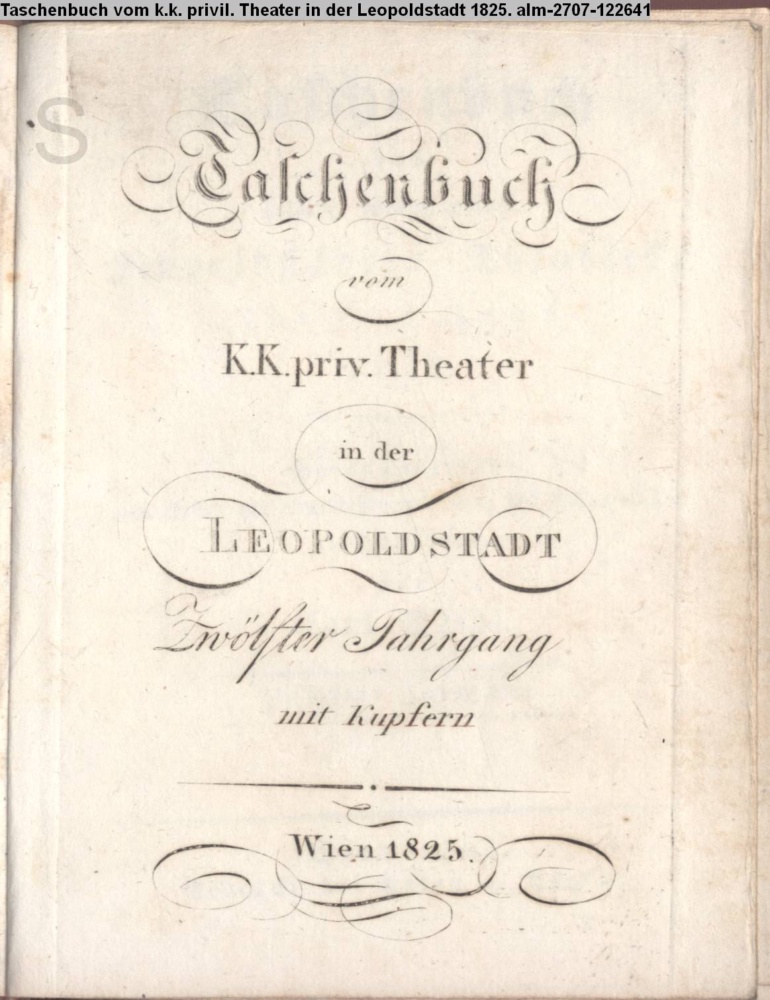 Taschenbuch / des / kaiserl. königl. privil. / Leopoldstädter Theaters, / für das Jahr / 1825. / Herausgegeben / zum Besten der hinterlassenen Familie des Schauspielers / Ziegelhauser, / von / Carl Meisl. / Zwölfter Jahrgang. / Wien 1825. / Gedruckt bey Anton v. Haykul