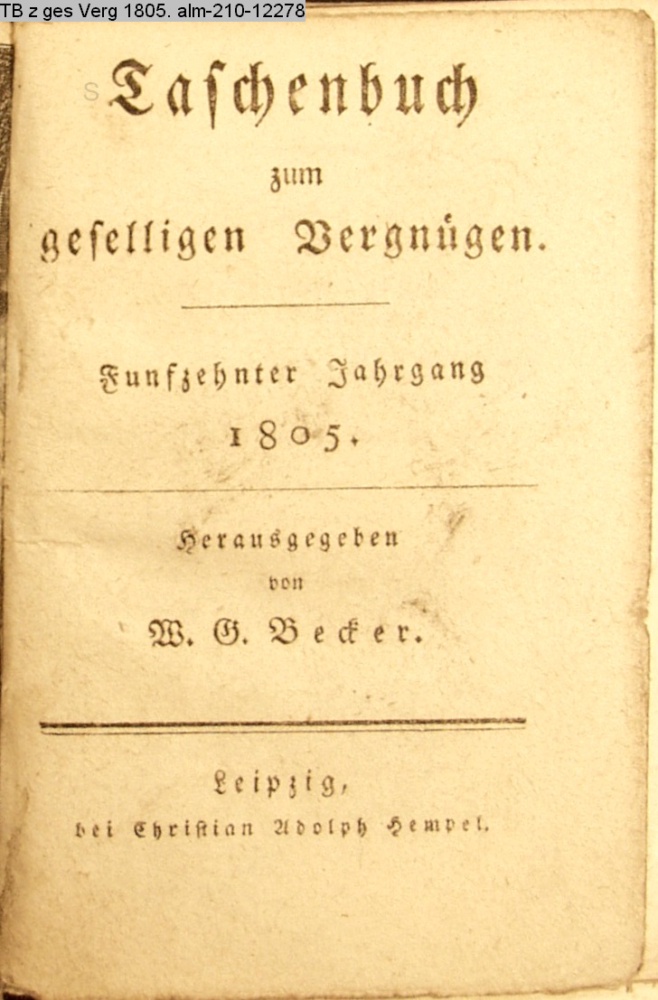 Taschenbuch / zum / geselligen Vergnügen. / Fünfzehnter Jahrgang / 1805. / Herausgegeben / von / W. G. Becker. / Leipzig, / bei Christian Adolph Hempel