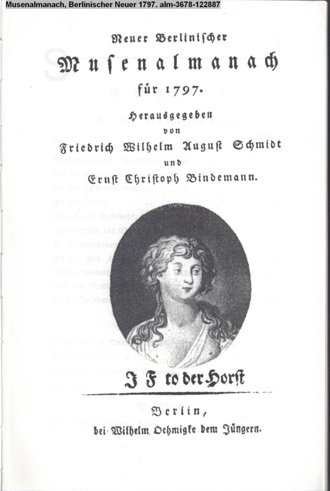 Neuer / Berlinischer / Musenalmanach / für 1797. / Herausgegeben / von / Friedrich Wilh. Aug. Schmidt / und / Ernst Christoph Bindemann. / Berlin, / bei Wilhlem Oehmigke dem Jüngern