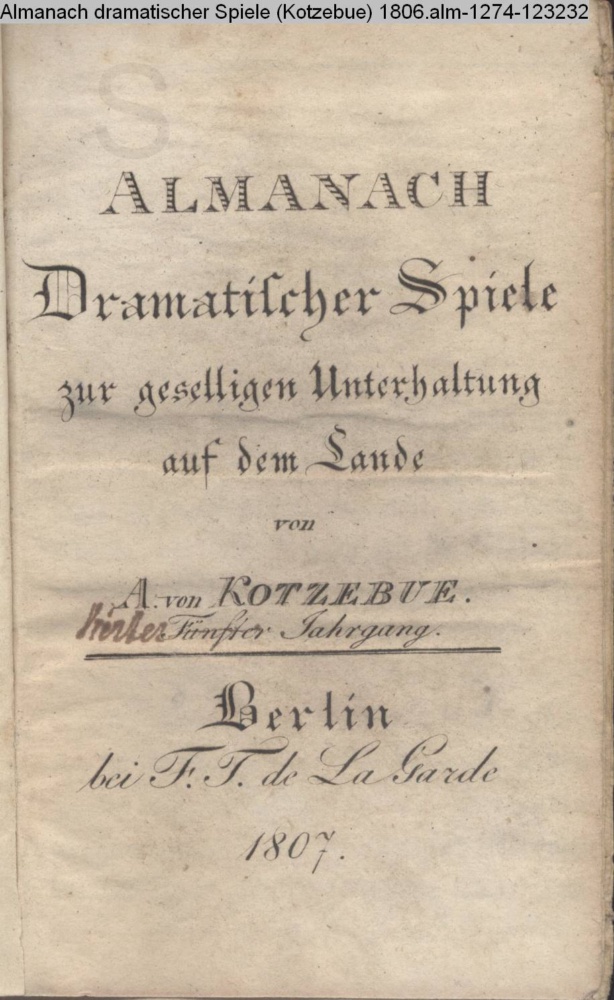 Almanach / Dramatischer Spiele / zur geselligen Unterhaltung / auf dem Lande / von / A. von Kotzebue. / Fünfter Jahrgang / Berlin / bei F. J. de La Garde / 1807 #