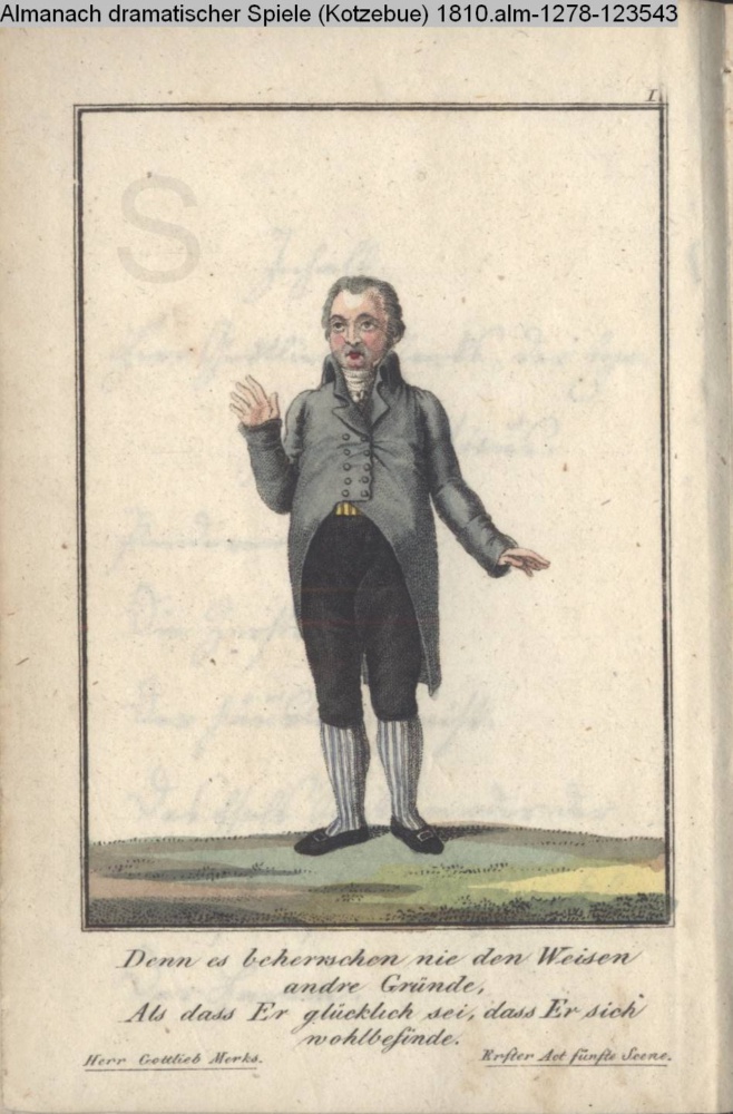 I. / Denn es beherrschen nie den Weisen /andre Gründe, / Als dass Er glücklich sei, dass Er sich / wohlbefinde. / Herr Gottlieb Merks. Erster Act fünfte Scene