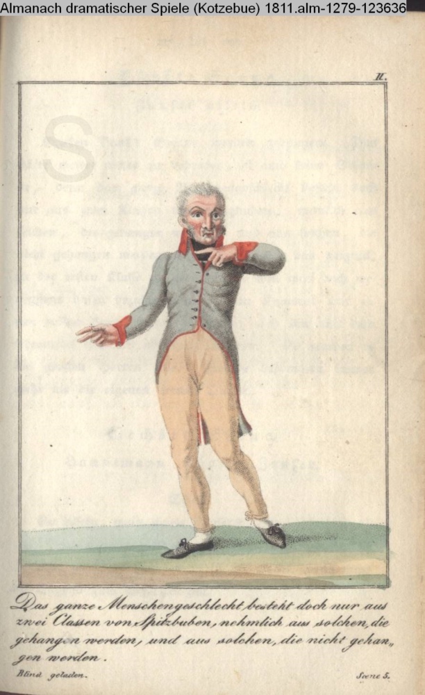 II. / Das ganze Menschengeschlecht besteht doch nur aus / zwei Classen von Spitzbuben, nehmlich aus solchen, die / gehangen werden, und aus solchen, die nicht gehan- / gen werden. / Blind geladen. Scene 5