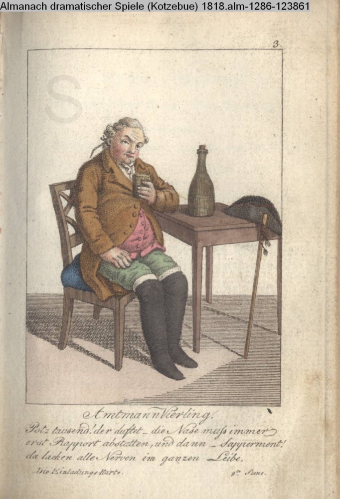 3. / Amtmann Vierling. / Potz tausend! der duftet – die Nase muß immer / erst Rapport abstatten, und dann – Sapperment! / da lachen alle Nerven im ganzen Leibe. / Die Einladungskarte. 9te Scene