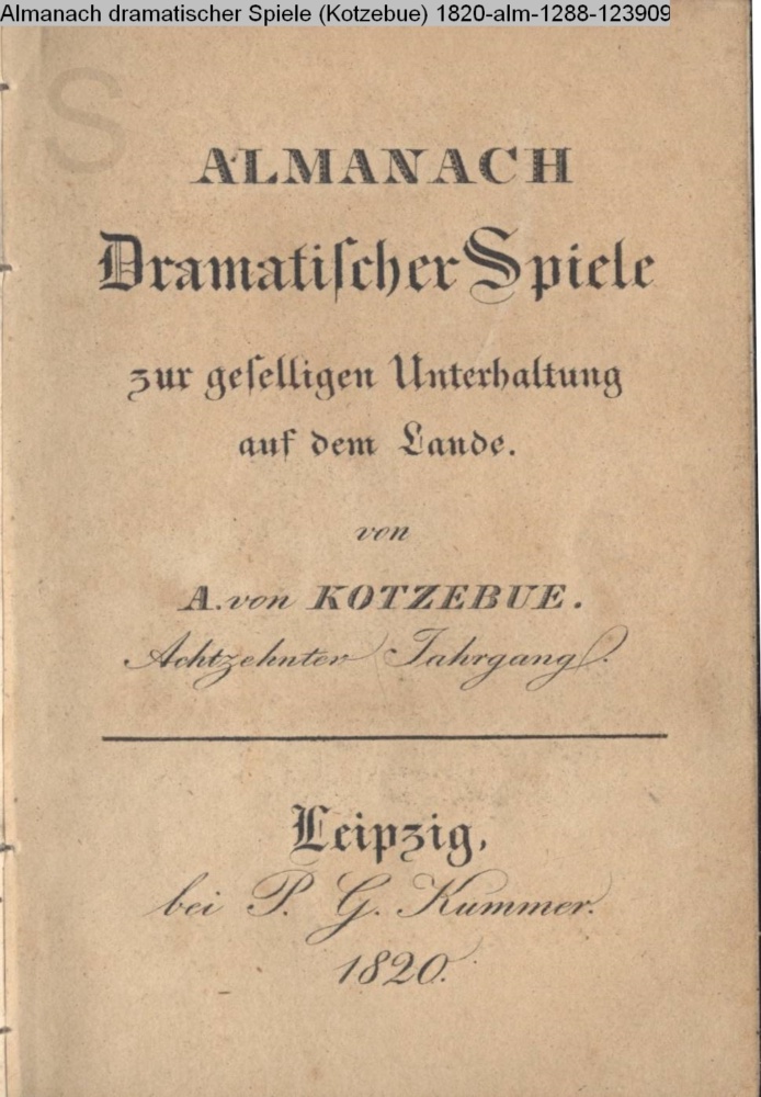 ALMANACH / Dramatischer Spiele / zur geselligen Unterhaltung / auf dem Lande / von / A. von KOTZEBUE. / Achtzehnter Jahrgang / Leipzig. / bei P. G. Kummer. / 1820