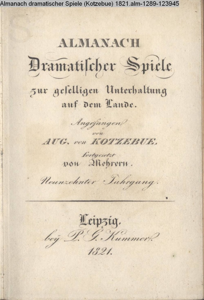 ALMANACH / Dramatischer Spiele / zur geselligen Unterhaltung / auf dem Lande / Angefangen / von / AUG. von KOTZEBUE, / fortgesetzt / von Mehrern. / Neunzehnter Jahrgang. / Leipzig. / bei P. G. Kummer / 1821