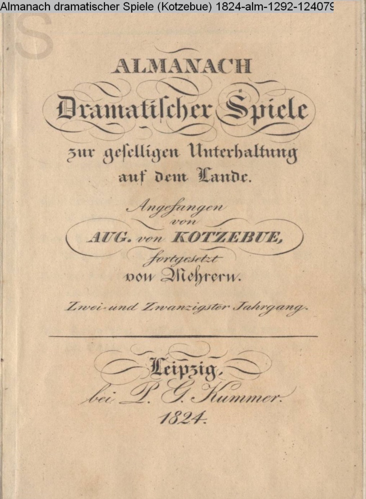 ALMANACH / Dramatischer Spiele / zur geselligen Unterhaltung / auf dem Lande. / Angefangen / von / AUG. von KOTZEBUE, / fortgesetzt / von Mehrern. / Zwei u. Zwanzigster Jahrgang. / Leipzig, / bei P. G. Kummer / 1824
