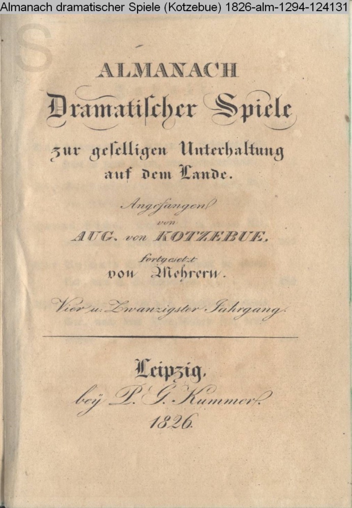 ALMANACH / Dramatischer Spiele / zur geselligen Unterhaltung / auf dem Lande. / Angefangen / von / AUG. von KOTZEBUE, / fortgesetzt / von Mehrern. / Vier u. Zwanzigster Jahrgang. / Leipzig. / bei P. G. Kummer / 1826