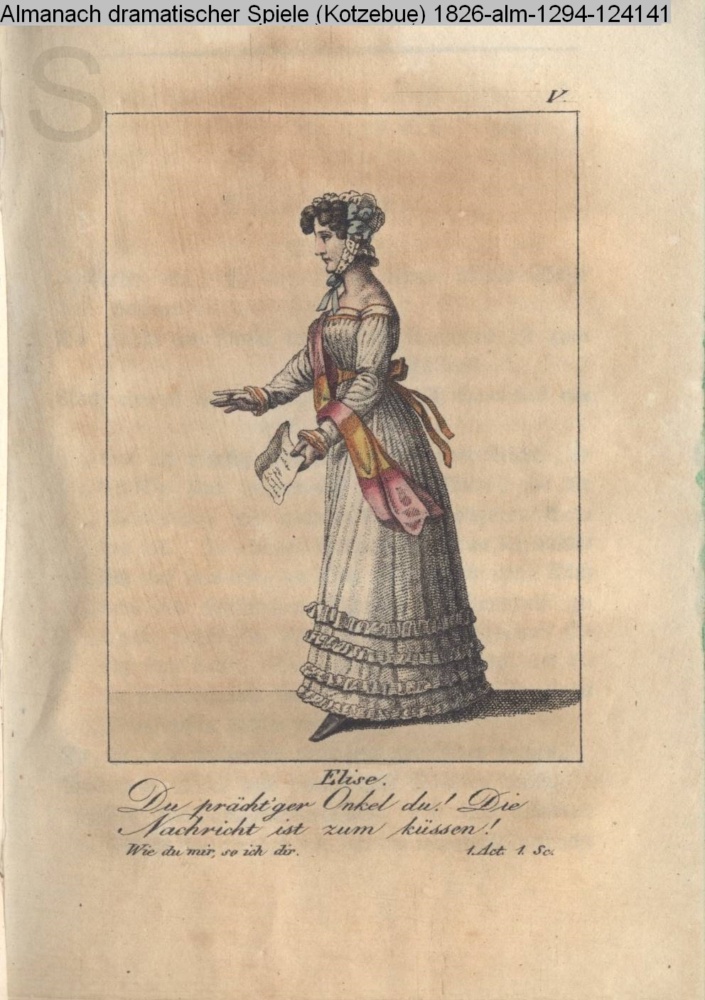 V. / Elise. / Du prächt’ger Onkel du! Die / Nachricht ist zum küssen! / Wie du mir, so ich dir. 1. Act. 1. Scene