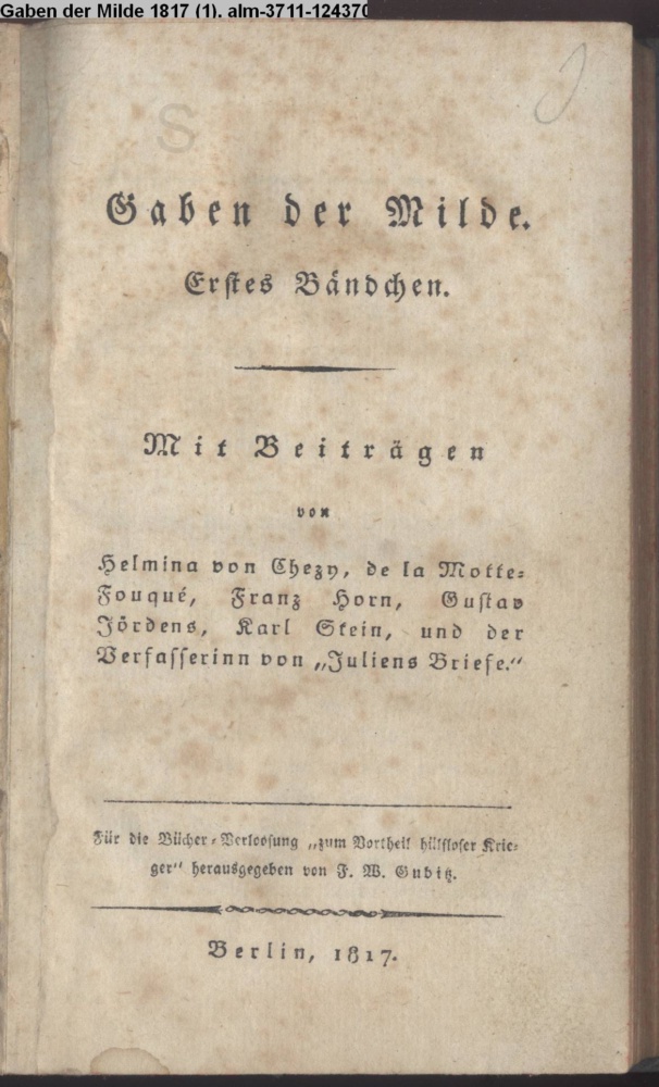 Gaben der Milde / Erstes Bändchen. / Mit Beiträgen / von / Helmina von Chezy, de la Motte- / Fouqué, Franz Horn, Gustav / Jördens, Karl Stein, und der / Verfasserin von Juliens Briefe. / Für die Bücher-Verloosung »zum Vortheil hülfloser Krie- / ger« herausgegeben von F. W. Gubitz. / Berlin, 1817