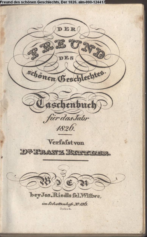 DER / FREUND / DES / schönen Geschlechtes. / Taschenbuch / für das Jahr / 1826. / Verfasst von / Dr. FRANZ RITTLER. / WIEN / bey Jos. Riedls sel. Wittwe, / im Schottenhofe No.136