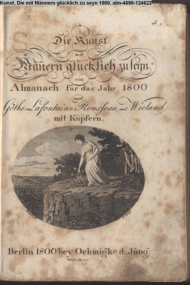 Die Kunst / mit / Männern glücklich zu seyn / ein / Almanach für das Jahr 1800 / nach / Göthe Lafontaine Rousseau und Wieland / mit Kupfern. / Berlin 1800 bey Oehmigke d. Jüng.