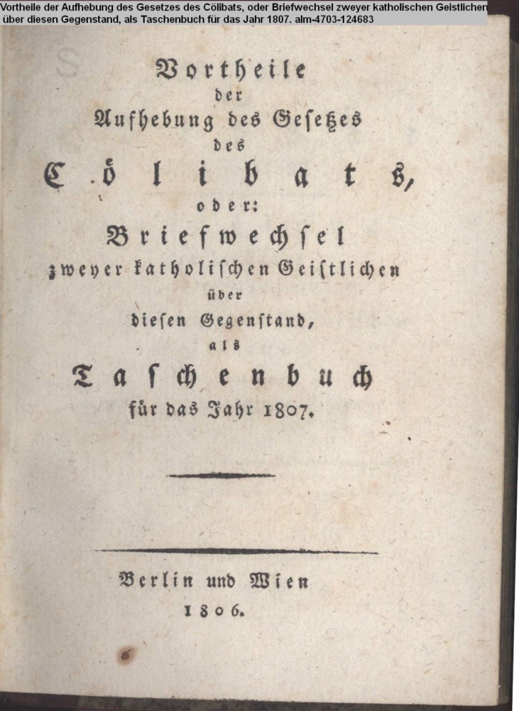Ist es Zeit / das / Cölibat / abzuschaffen? / Auflösung / dieser Frage / in dem / Briefwechsel zweier katholischen / Gesitlichen. / Nach der französischen Handschrift übersetzt. / Tempera mutantur et nos mutamur in illis. / Berlin und Wien / 1806