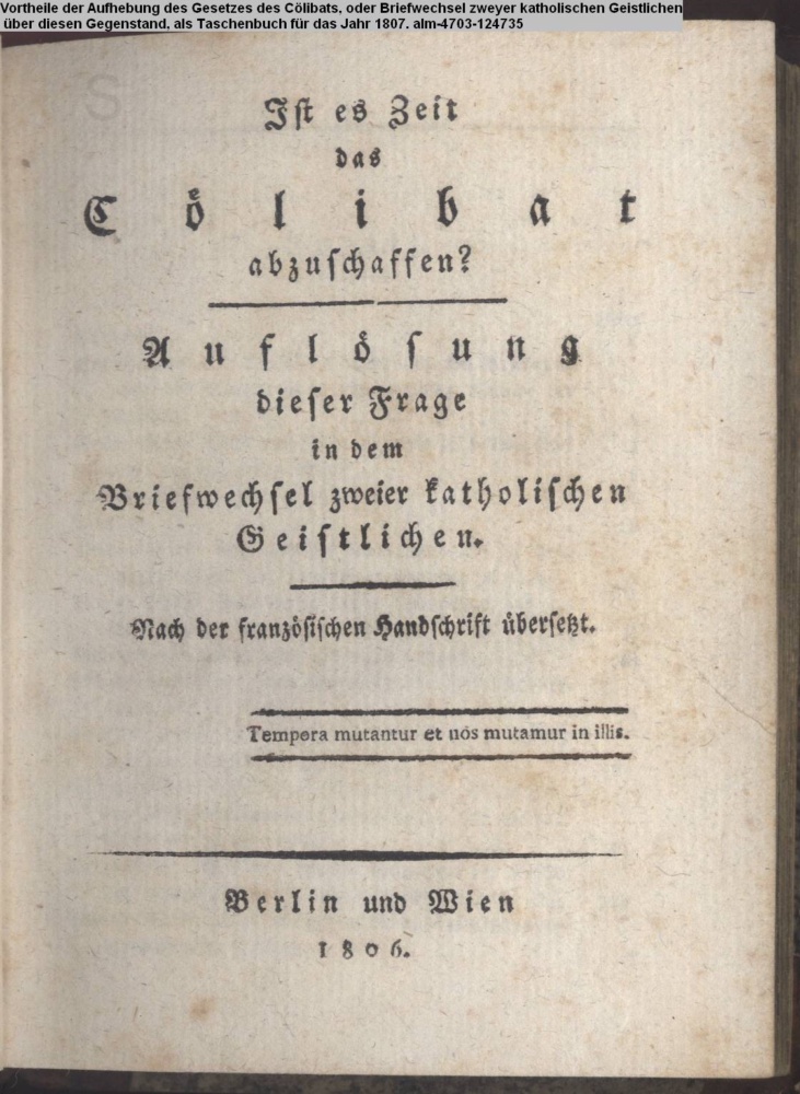 Vortheile / der / Aufhebung des Gesetzes / des / Cölibats, / oder / Briefwechsel / zweyer katholischen Geistlichen / über / diesen Gegenstand, / als / Taschenbuch / für das Jahr 1807. / Berlin und Wien / 1806