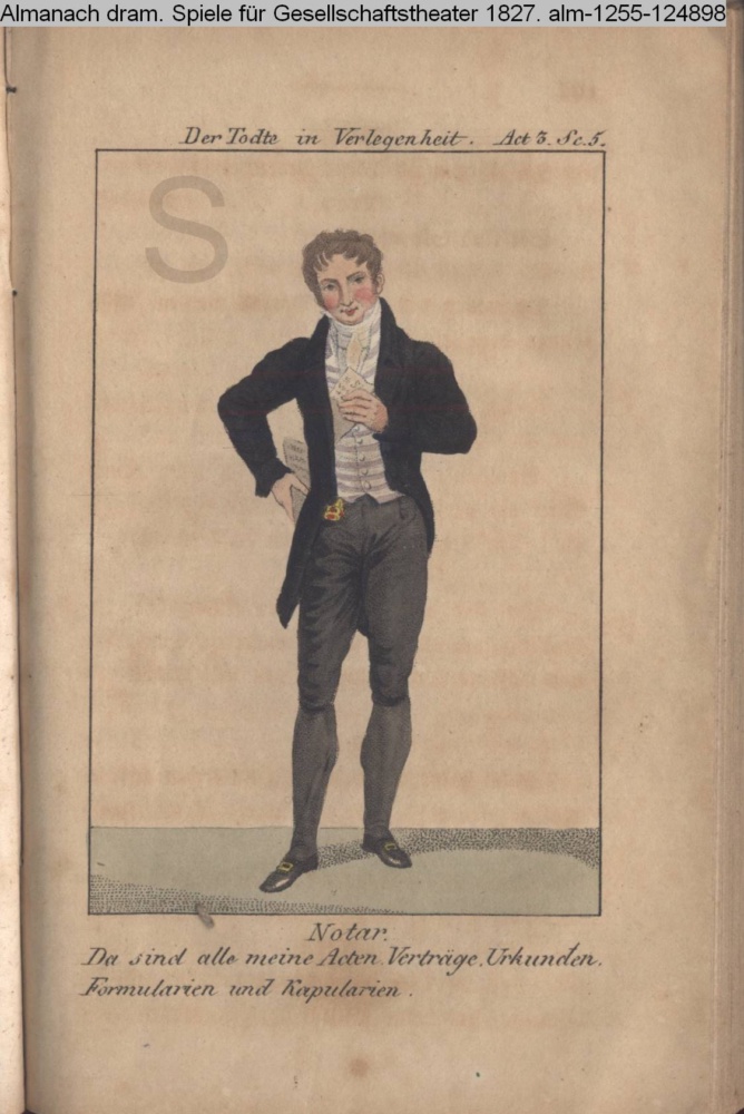 Der Todte in Verlegenheit. Act 3. Sc. 5. / Notar / Da sind meine Acten, Verträge, Urkunden / Formularien und Kapularien.