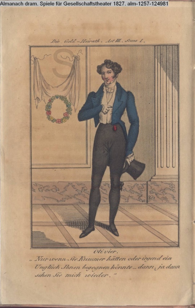 Die Geld-Heirath. Act III. Scene 1. / Olivier. / »Nur wenn Sie Kummer hätten oder irgend ein / Unglück Ihnen begegnen könnte – dann, ja dann / sehen Sie mich wieder.«