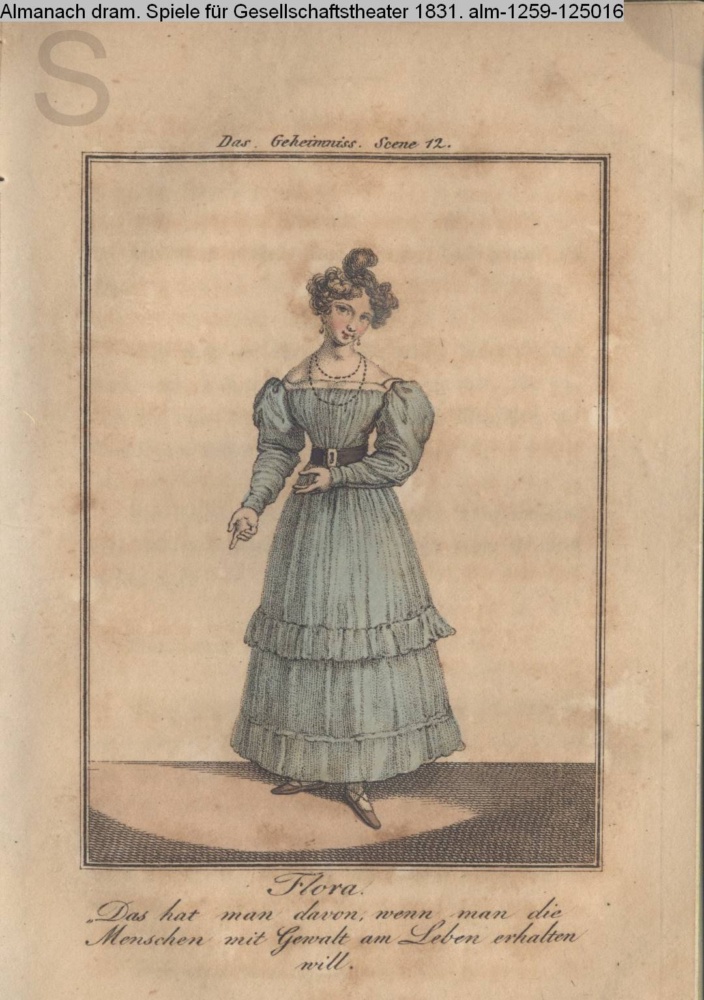 Das Geheimniss. Scene 12. / Flora. / »Das hat man davon, wenn man die / Menschen mit Gewalt am Leben erhalten / will.«