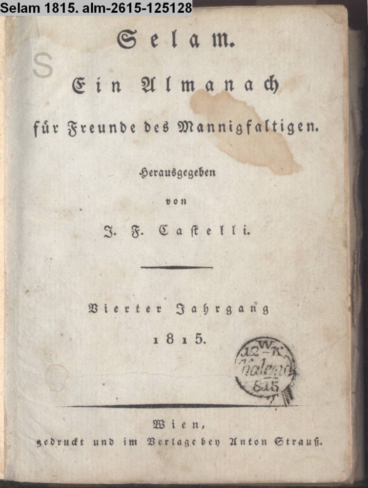 Selam. / Ein Almanach / für Freunde des Mannigfaltigen. / Herausgegeben / von / I. F.Castelli. / Vierter Jahrgang / 1815. / Wien, / gedruckt und im Verlage bey Anton Strauß