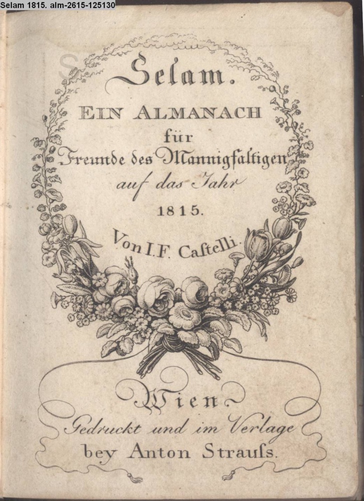 Selam. / EIN ALMANACH / für / Freunde des Mannigfaltigen / auf das Jahr / 1815. / Von I. F. Castelli. / Wien / Gedruckt und im Verlage / bey Anton Strauss