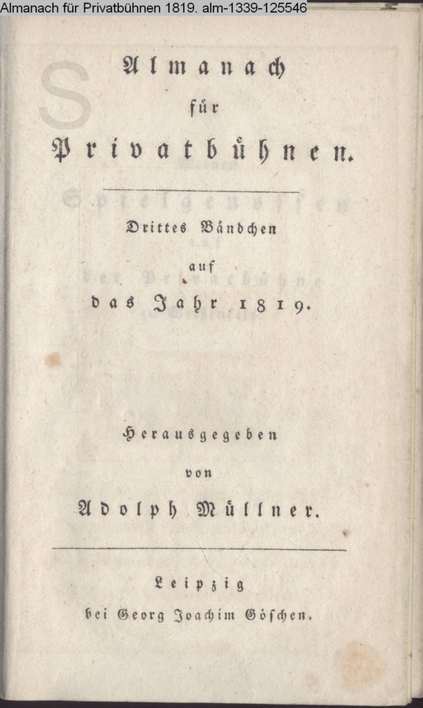 Almanach / für / Privatbühnen. / Drittes Bändchen / auf / das Jahr 1819. / Herausgegeben / von / Adolph Müllner. / Leipzig / bei Georg Joachim Göschen