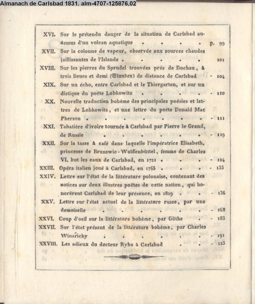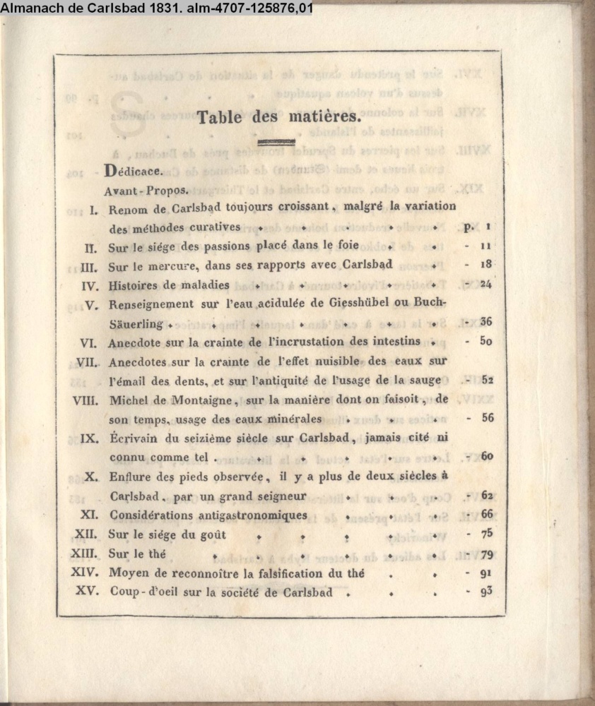 ALMANACH / DE CARLSBAD, / OU MÉLANGES MÉDICAUX, SCIENTIFIQUES ET LITÉRAIRES, / RELATIFS A CES THERMES ET AU PAYS. / PAR / LE CHEVALIER JEAN DE CARRO, / docteur en médecine de facoultés d'Edinbourg, de Vienne et de / Prague, et praticien à Carlsbad pendant la saison / des eaux. / Singula quaeque locum teneant sortita decenter. / Hor. Ars. poët. v. 92 / 1. Année. / PRAGUE, 1831