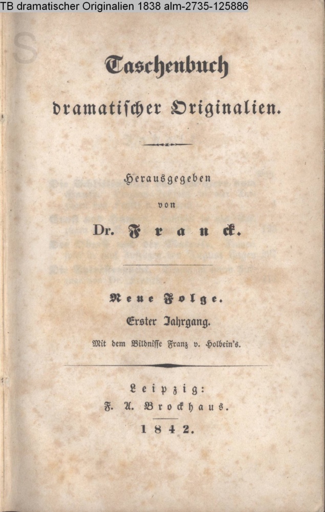Taschenbuch / dramatischer Originalien. / Herausgegeben / von Dr. Franck. / Neue Folge. / Erster Jahrgang. / Mit dem Bildnisse Franz v. Holbein's. / Leipzig: / F. A. Brockhaus. / 1842