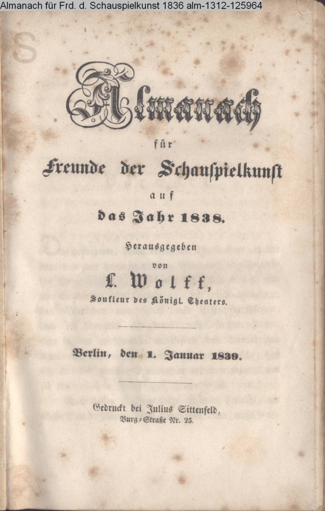 Almanach / für / Freunde der Schauspielkunst / auf / das Jahr 1838. / Herausgegeben / von / L. Wolff, / Soufleur des Königl. Theaters. / Berlin, den 1. Januar 1839. / Gedruckt bei Julius Sittenfeld, / Burg-Straße Nr. 25
