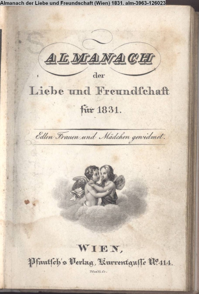ALMANACH / der / Liebe und Freundschaft / für 1831. / Edlen Frauen und Mädchen gewidmet. / WIEN, / Pfautsch's Verlag, Kurrentgasse No. 414