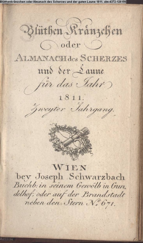 Blüthen Kränzchen / oder / ALMANACH des SCHERZES / und der Laune / für das Jahr / 1811 / Zweyter Jahrgang. / WIEN / bey Joseph Schwarzbach / Buchb. in seinem Gewölb in Gun- / delhof auf der Brandstadt / neben den Stern No. 671