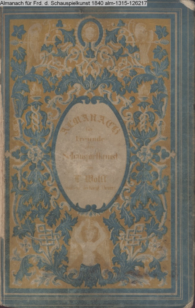 Almanach / für / Freunde der Schauspielkunst / auf / das Jahr 1841. / Herausgegeben von / L. Wolff, / Soufleur des Königl. Theaters. / Berlin, den 1. Januar 1842. / Gedruckt bei Julius Sittenfeld. / Burg-Straße No. 25