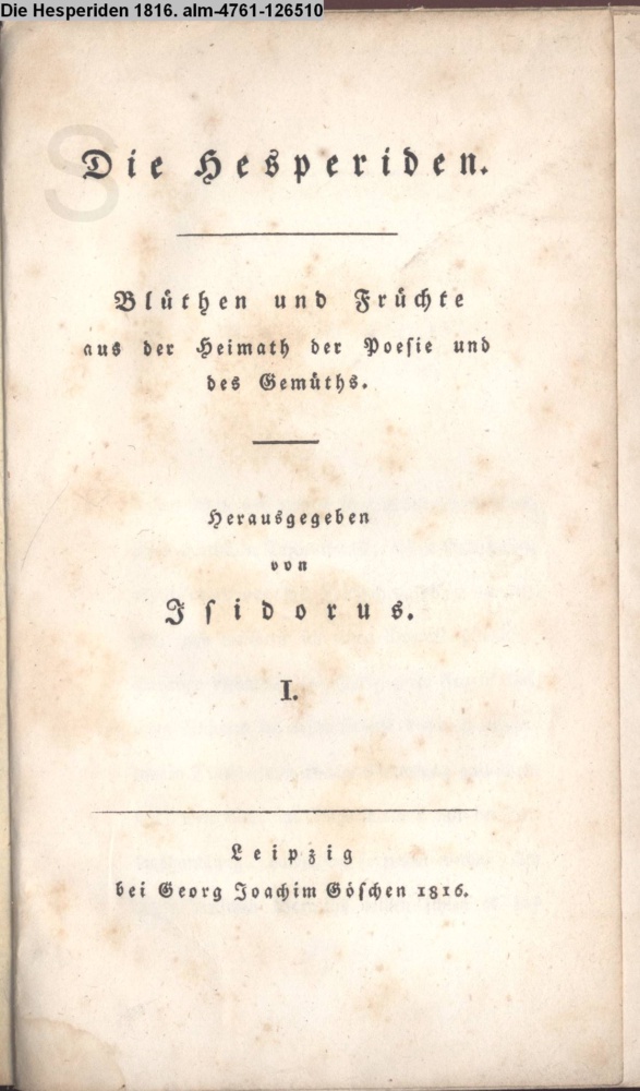Die Hesperiden. / Blüthen und Früchte / aus der Heimath der Posie und / des Gemüths. / Herausgegeben / von / Isidorus. / I. / Leipzig / bei Georg Joachim Göschen 1816
