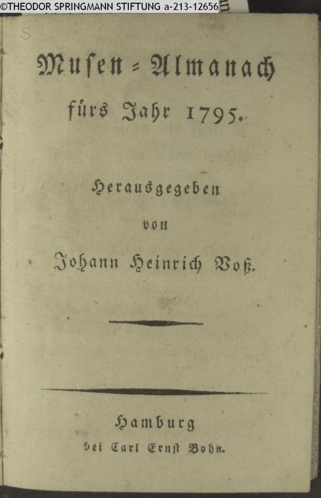 Musen-Almanach / fürs Jahr 1795. / Herausgegeben / von / Johann Heinrich Voß. / Hamburg / bei Carl Ernst Bohn